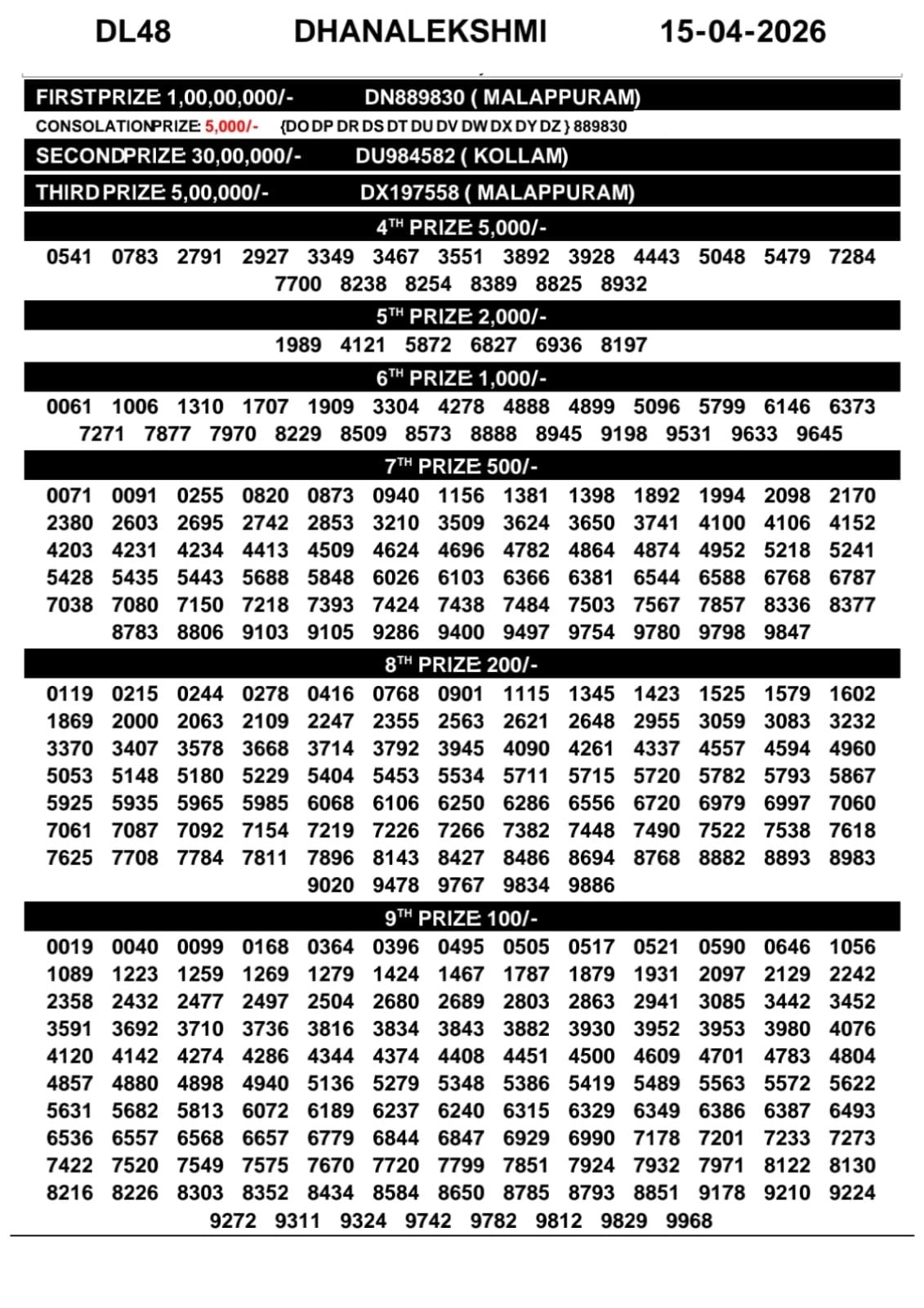Today the result for Dhanalekshmi DL48 dated 15-04-2026 will be updated through the daily Kerala lottery result process. This page is built to facilitate Publishing of Official Kerala Lottery Result Today with date variants like April 15 2026 and 15 April 2026.