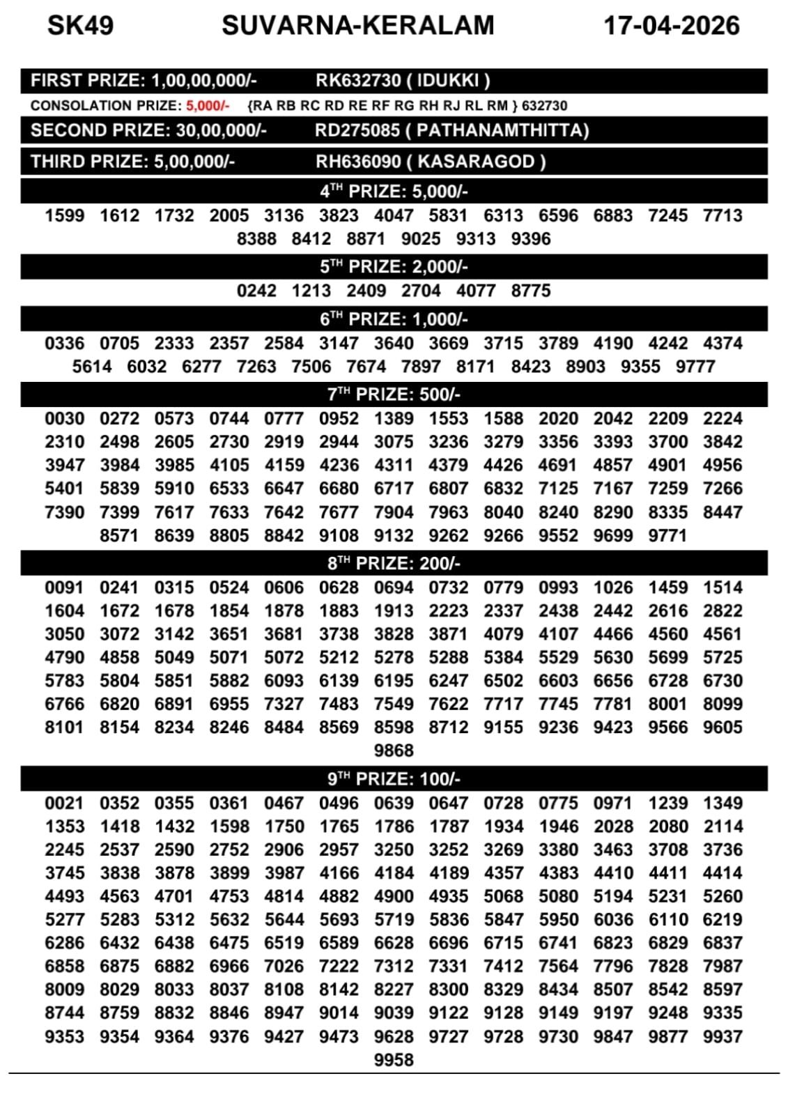Kerala Lottery Result Today April 17 2026 — Suvarna Keralam SK49