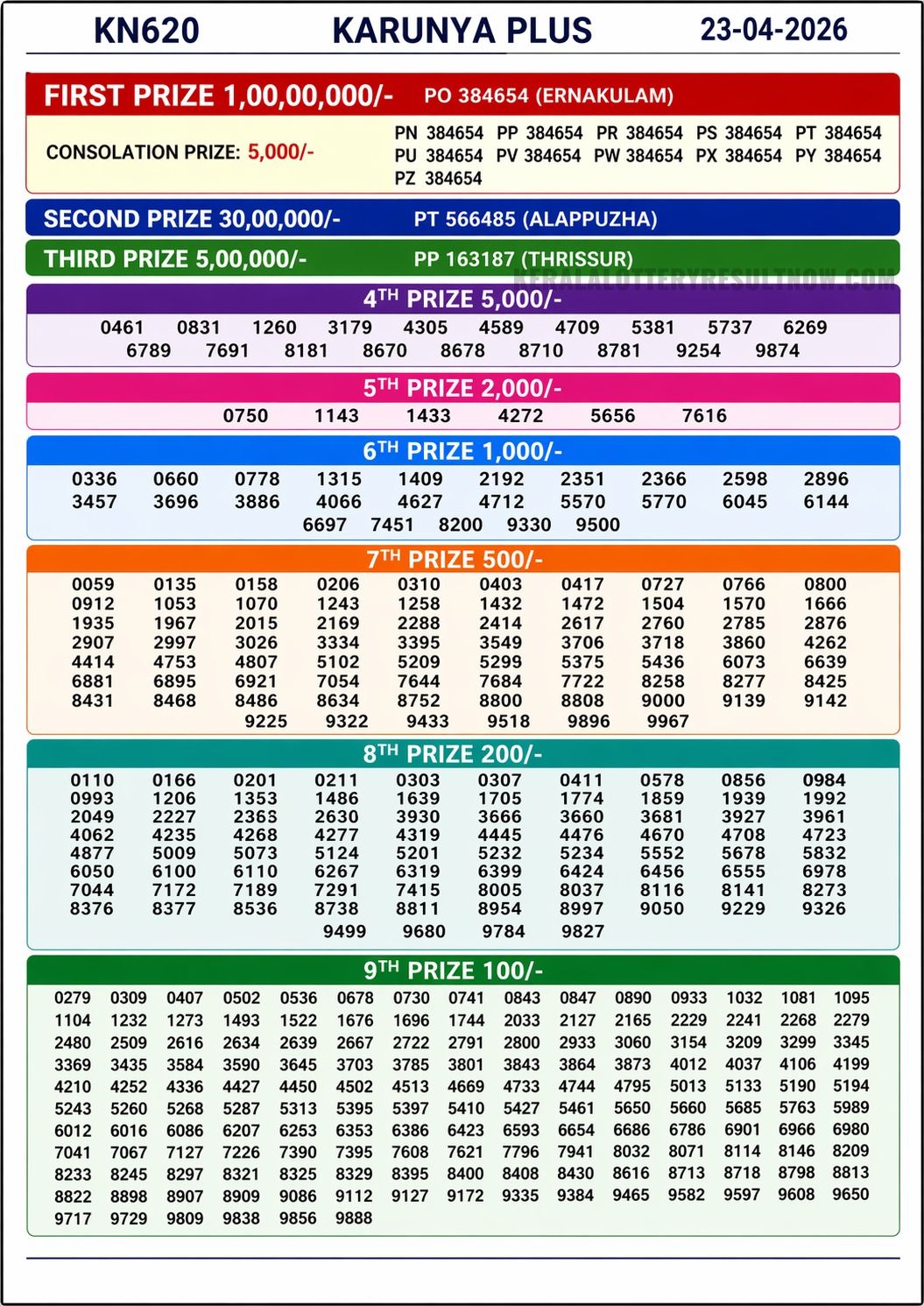 Today the result for Karunya Plus KN620 dated 23-04-2026 will be updated through the daily Kerala lottery result process. This page is built to facilitate Publishing of Official Kerala Lottery Result Today with date variants like April 23 2026 and 23 April 2026.